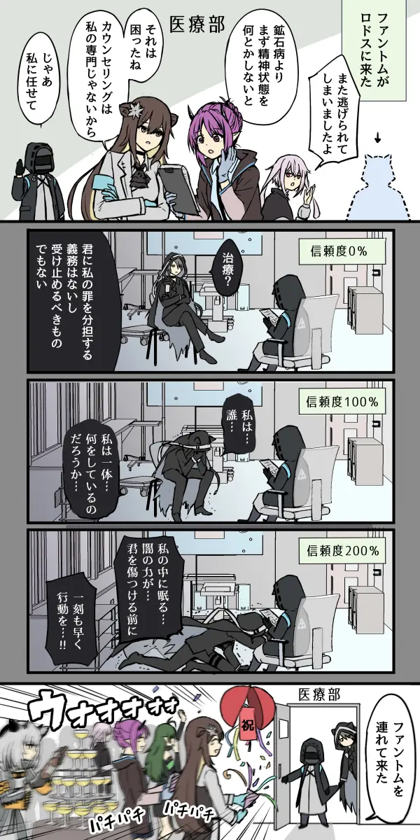 Characters: ansel_(arknights) doctor_(arknights) folinic_(arknights) gavial_(arknights) hibiscus_(arknights) phantom_(arknights) ptilopsis_(arknights)